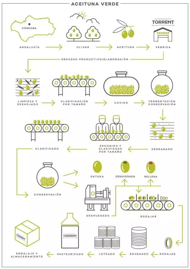 Para degustar las aceitunas de mesa, tal y como las consumimos, deben pasar por distintos procesos de elaboración, a través de los cuales se elimina el amargor natural de las aceitunas crudas. La duración del proceso que va desde la recogida del fruto en el campo, hasta el inicio de la fase de conservación, es de aproximadamente 6 meses. A continuación, detallamos su proceso productivo.